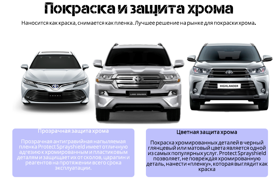 Напыляемое покрытие, после нанесения на кузов автомобиля через краскопульт, образует снимаемую прозрачную или цветную пленку толщиной более 200 мкм, имеющую автомобильную шагрень и блеск. Покрытие Protect Sprayshield может наноситься на детали любых форм, в отличие от пленок. Protect Sprayshield имеет одинаково хорошую адгезию к металлу, пластику и даже хрому.