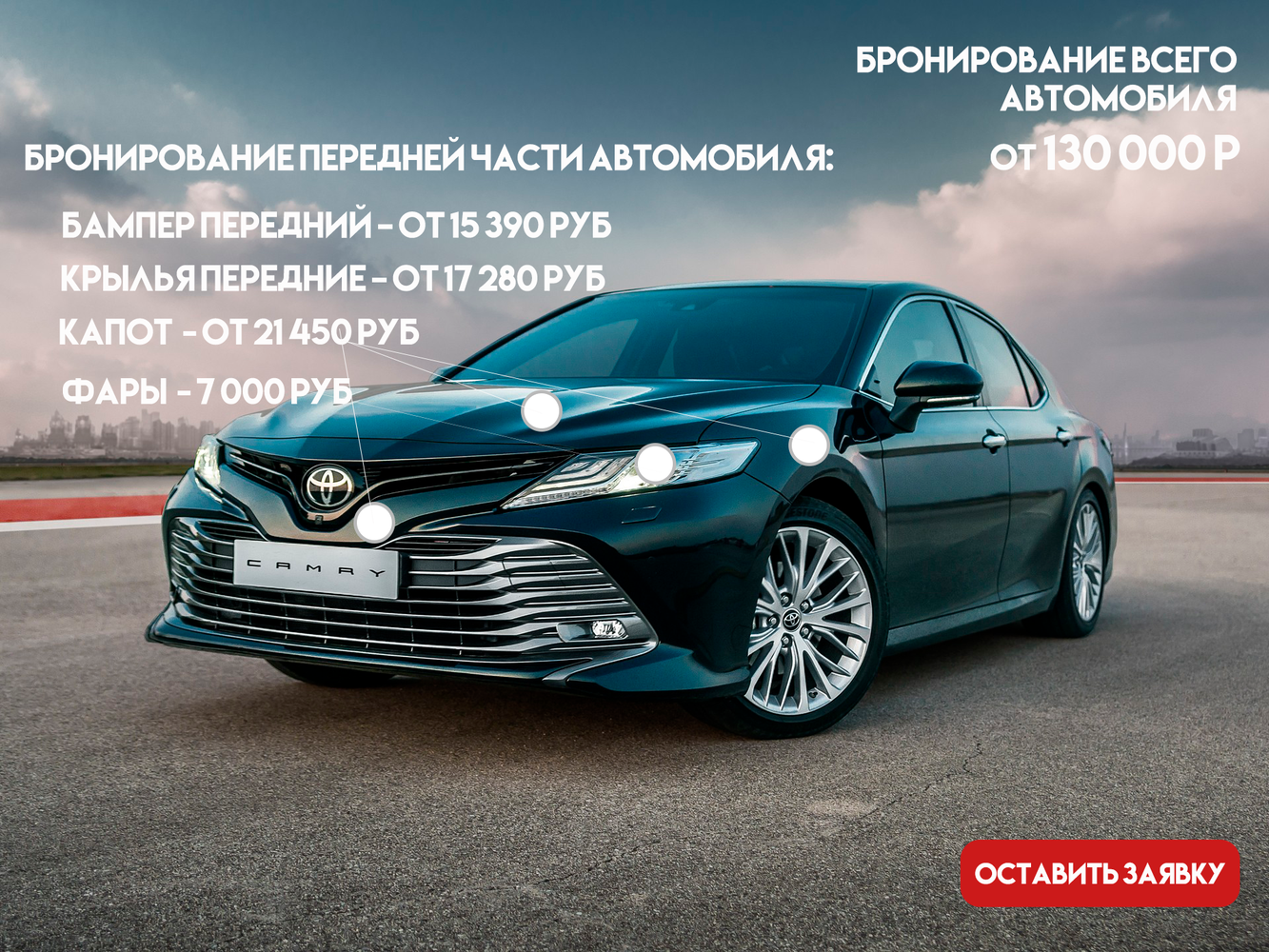 Бронирование передней части автомобиля:Бампер передний – от 15 390 рублейКрылья передние - от 17 280 рублейКапота – от 21 450 рублейФары – 7 000 рублей |